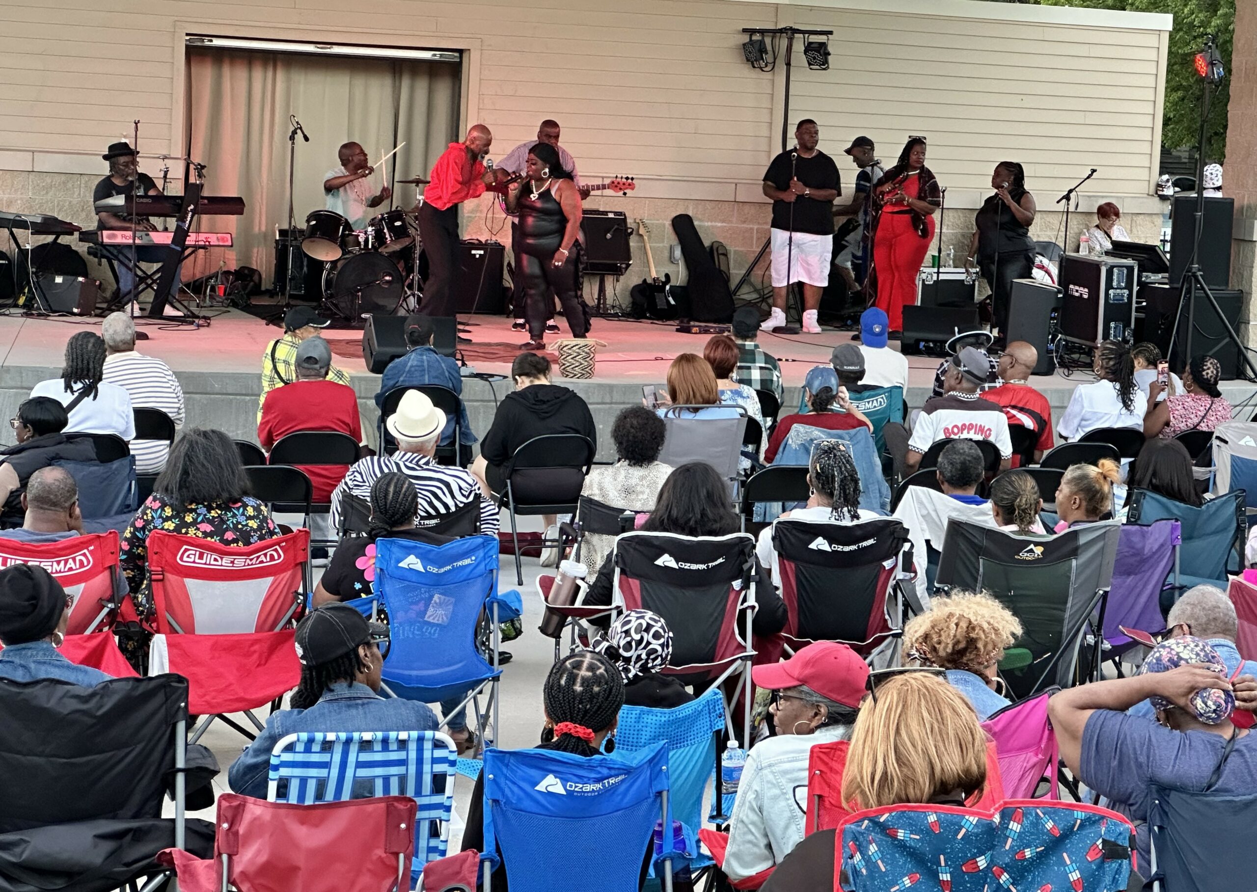 Indaba Nights, the community-friendly, fully accessible concert series co-hosted by St. Ann Center at the Indaba Band Shell, kicked off its 2024 season with a large and enthusiastic crowd and a dynamite performance by Showdown, featuring Tony TNT Washington and his Explosive Divas.