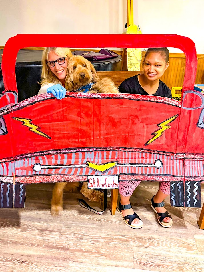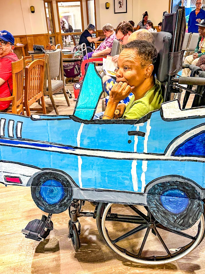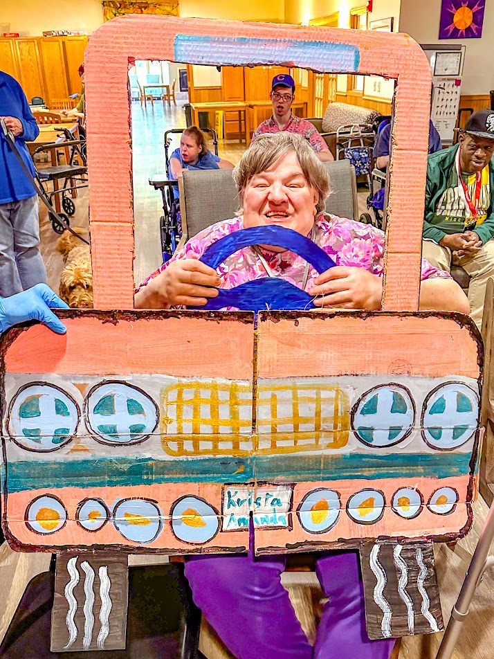 But first, they needed “cars.” With a lot of cardboard and a little ingenuity, Intergenerational Activities Director Cara Gaitens and artistically inclined adult clients fashioned brightly colored makeshift rides for every taste. A pair of sheets served as a jumbo screen, and plenty of popcorn was at the ready. Daycare kids — and even Gaitens’ loveable doodle, Rusty — came to join the fun. Couples cuddled close. And National Drive-In Movie Day was underway.
