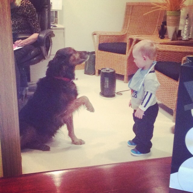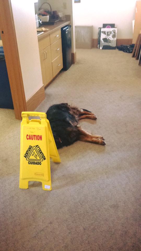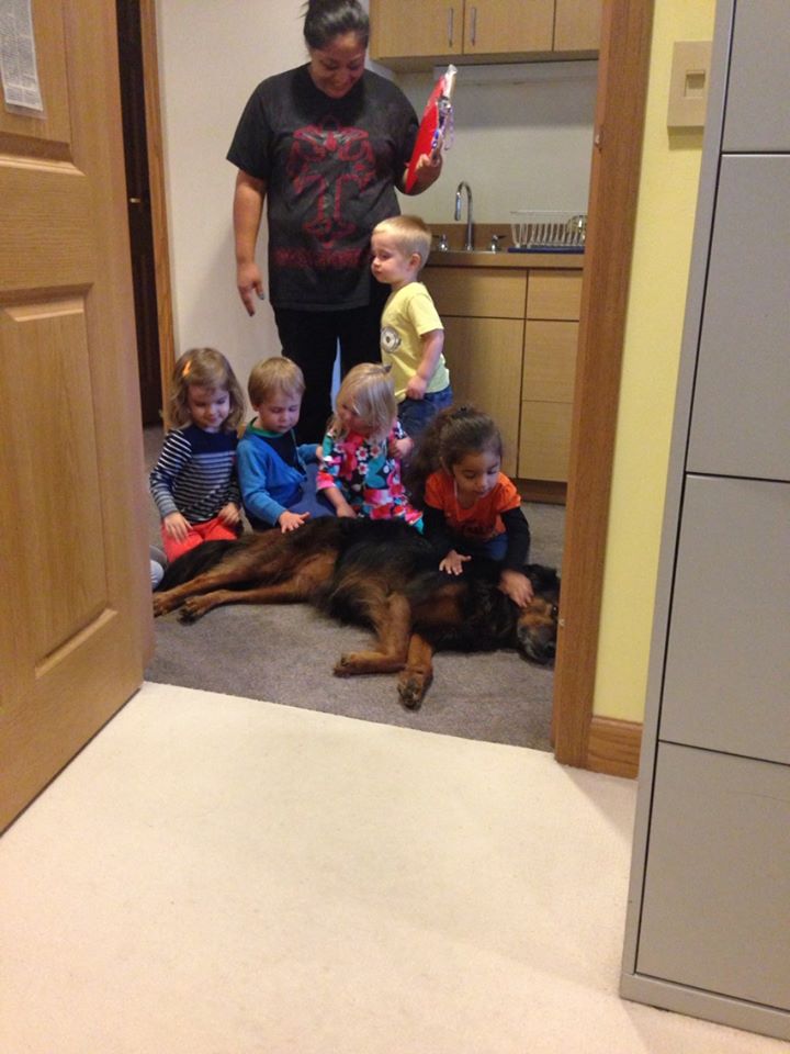 “She loves stretching out in the middle of the hall so no one can walk by without giving her attention,” Casey says. At least once a week, the childcare kids visit the Administration hallway looking for a chance to pet her. It’s not uncommon for eight of them to crowd around the mellow dog, giggling as she licks their faces. “Since kids are on her level, they’re easy targets,” Casey adds.